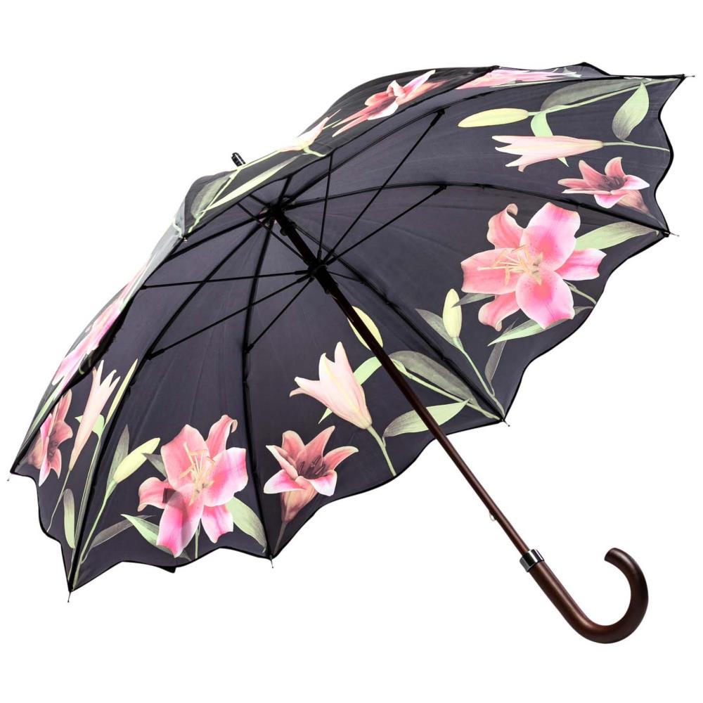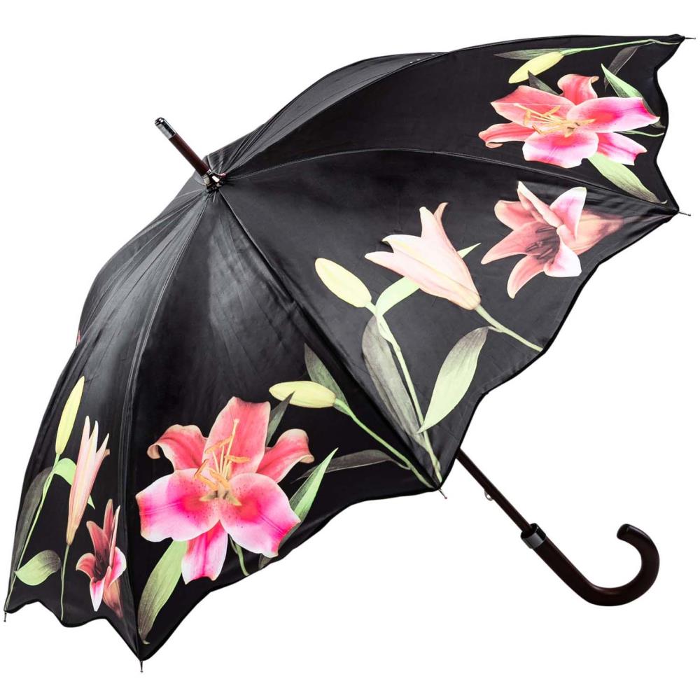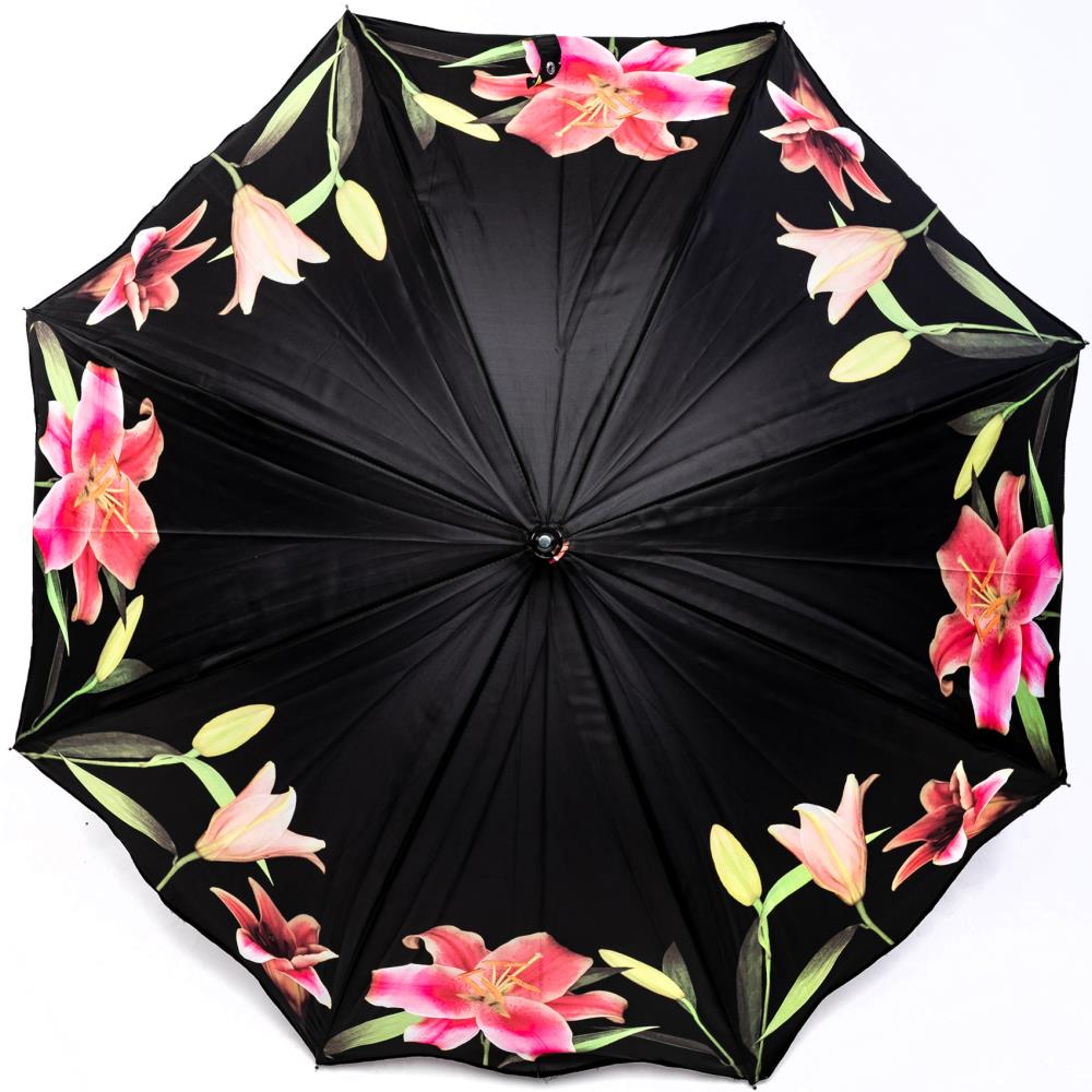Große leuchtende Lilien schmiegen sich an den Rand dieses hochwertigen Stockschirms. Auf dem schwarzen Hintergrund strahlen Sie in zartem Rosé, kräftigem Pink und sanften Grün. Modebewusste Damen werden von diesem edlen Schirm mit seinen sanft geschwungenen Rändern begeistert sein. Dieser Schirm ist nicht nur ein modisches Accessoire - er fällt auf. Nicht nur für Blumenliebhaber geeignet!