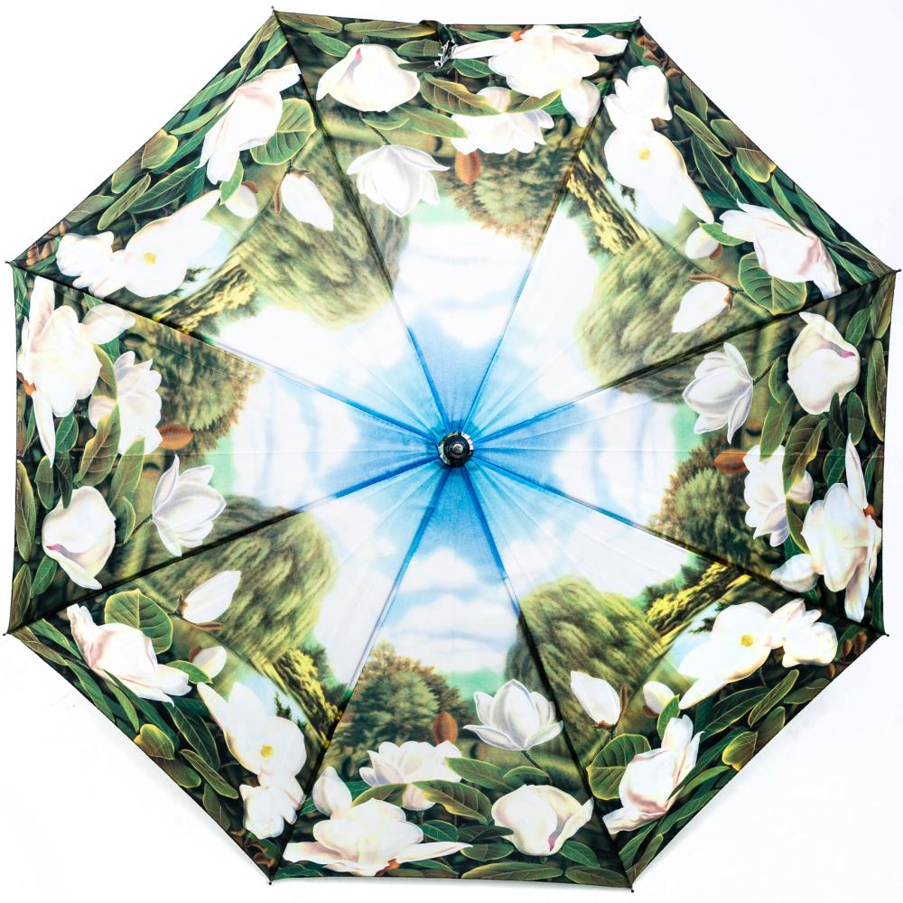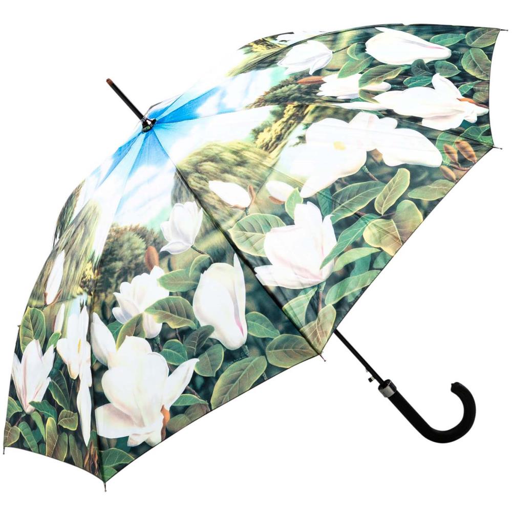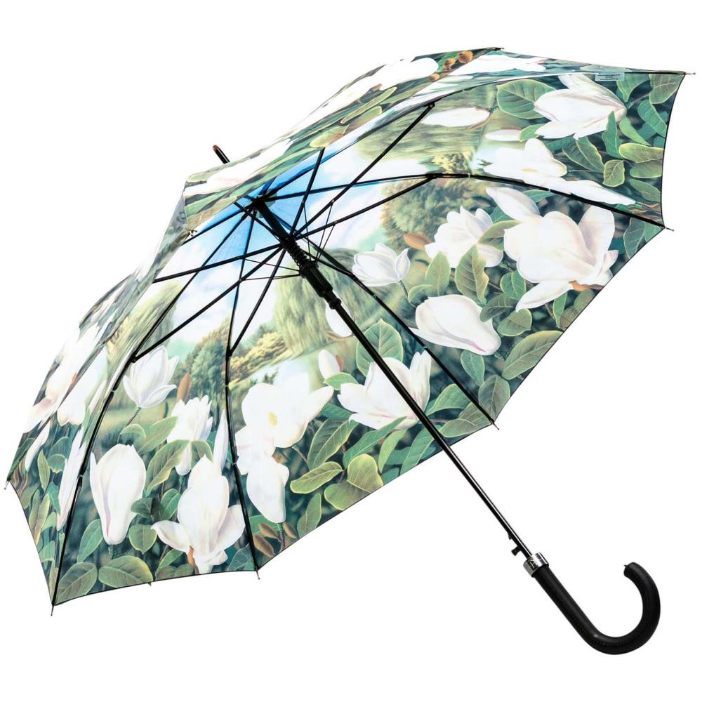Gartenliebhaber und Blumenfreunde werden bei diesem außergewöhnlichen Schirm ins Schwärmen geraten. Mit seinen zarten Farben in Grün, Weiß und Blau erhellt er Ihren Alltag. Die weißen Magnolienblüten werden von verschiedenen Grüntönen umrahmt und schmiegen sich an den Rand des Schirms. In der Mitte des Schirms wölbt sich der Stoff in freundlichem Himmelblau. Ein außergewöhnlicher Schirm für außergewöhnliche Menschen.