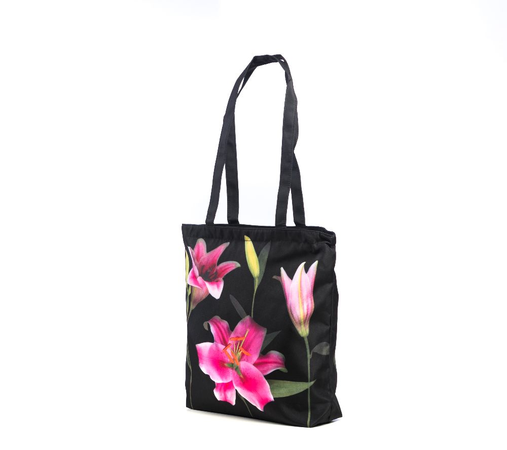 Große leuchtende Lilienblüten auf schwarzem Grund zieren diese außergewöhnliche Tasche. Mit dieser Tasche heben Sie sich modisch ab. Ein absolutes Muss für Liebhaber dieser tollen Blumen! Ideal für viele Gelegenheiten – ganz gleich ob beim Einkaufsbummel, beim Sport oder auf dem Weg zur Arbeit. Praktische Einkaufstasche und modisches Accessoire für Damen!