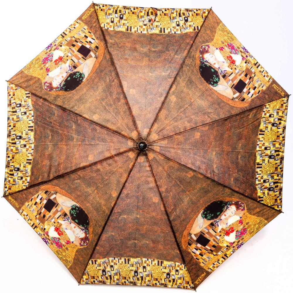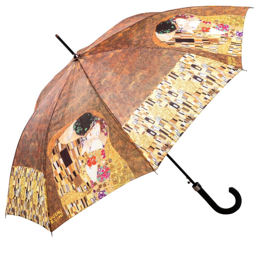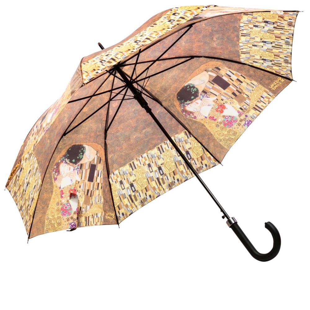 Das Motiv DER KUSS - Liebespaar nach dem Ölgemälde des Malers Gustav Klimt von 1908/09 zeigt ein Liebespaar, welches innig einander zugwandt ist. Es ist eines der bedeutesten Werke des bekannten Wiener Jugendstilmalers und entstand in der sogenannten goldenen Pheriode des Künstler. Durch seine warmen Gold- und Brauntöne ist dieser elegante Stockschirm ein echter Hingucker. Das sanfte Farbenspiel erhellt das Gemüt und wärmt die Seele - ganz gleich wie grau und trübe das Wetter auch ist - ein zuverlässiger Begleiter bei jeder Witterung.