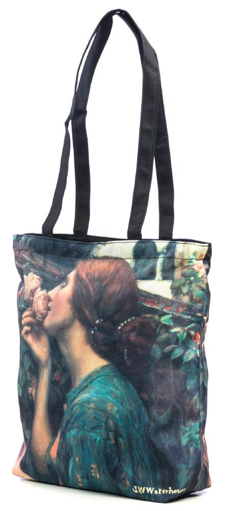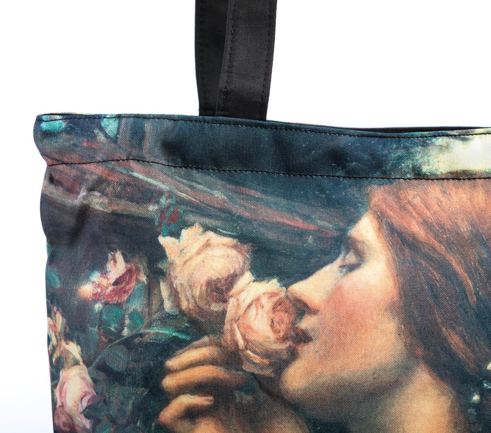 Die Tasche zeigt das Bild einer Frau, welche an einer Rose schnuppert und den Duft dieser königlichen Blume genießt. Dieses romantische Motiv nach dem Ölgemälde des Maler John William Waterhouse mit dem Titel The Soul of the Rose von 1908 bezaubert von Anfang an. Es ist fast so als könnte man den betörenden Duft der Rosen selbst wahrnehmen. Dieses Kunstwerk ist ein Blickfang und unterstreicht Ihre Individualität.