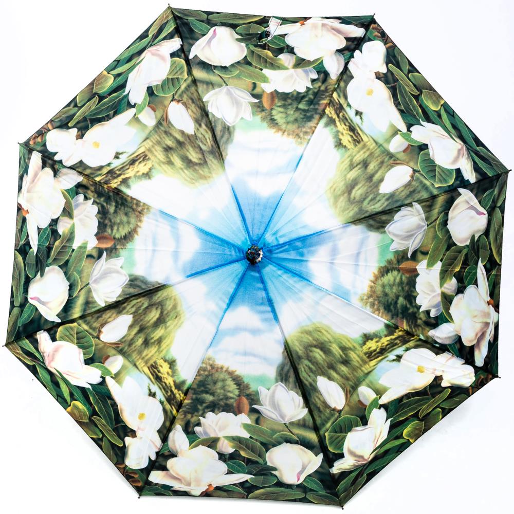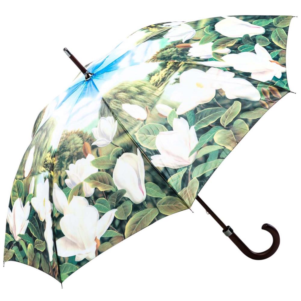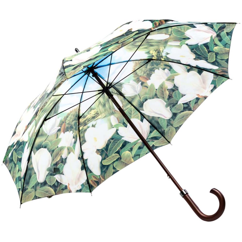 Mit diesem wunderschönen Schirm und seinen sanften Grüntönen bleiben Sie auch bei tristem Regenwetter ruhig und gelassen. Sein Farbenspiel mit zart blauem Himmel in der Mitte und prächtigen weißen Magnolienblüten am Rand wirkt beruhigend und symbolisiert zugleich die Stärke der Natur.